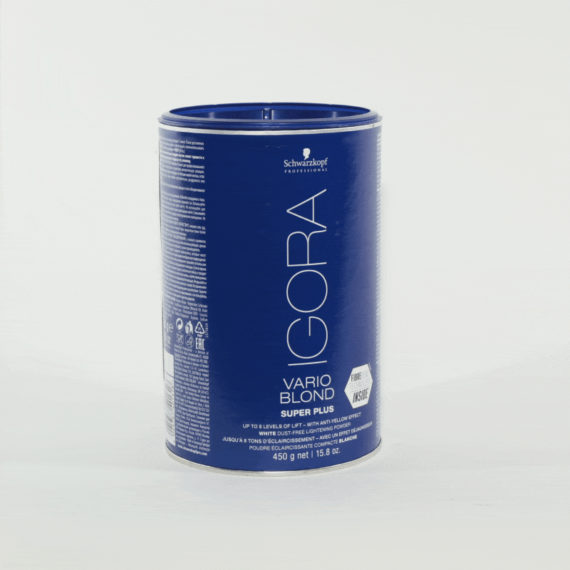 שוורצקוף איגורה בלונד סופר פלוס. אבקת הבהרה לבנה מופחתת אבק המספקת עד כ-8 רמות הרמה ונטרול מדויק עם טכנולוגיית פייברפלקס לחיזוק קשרי סיב השערה. מייצרת קשרים חדשים בתוך סיב השערה.