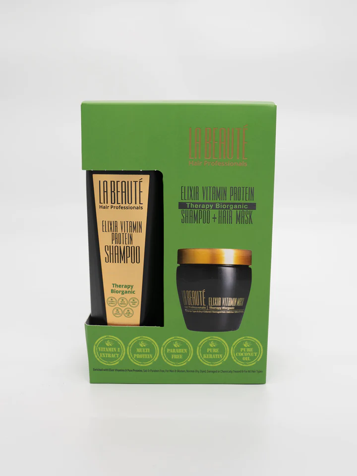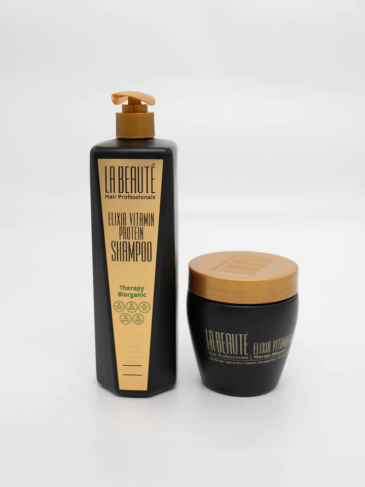 ערכת מוצרי שיער של חברת לה בוטה. מכילה שמפו אלקסיר 750מ"ל ומסכה אלקסיר 500מ"ל ללא מלחים וללא פרבנים. מועשר בקרטין וויטמין E מתאים לשיער שעבר החלקה וטיפולים כימיים כגון צבע, גוונים, הבהרה.